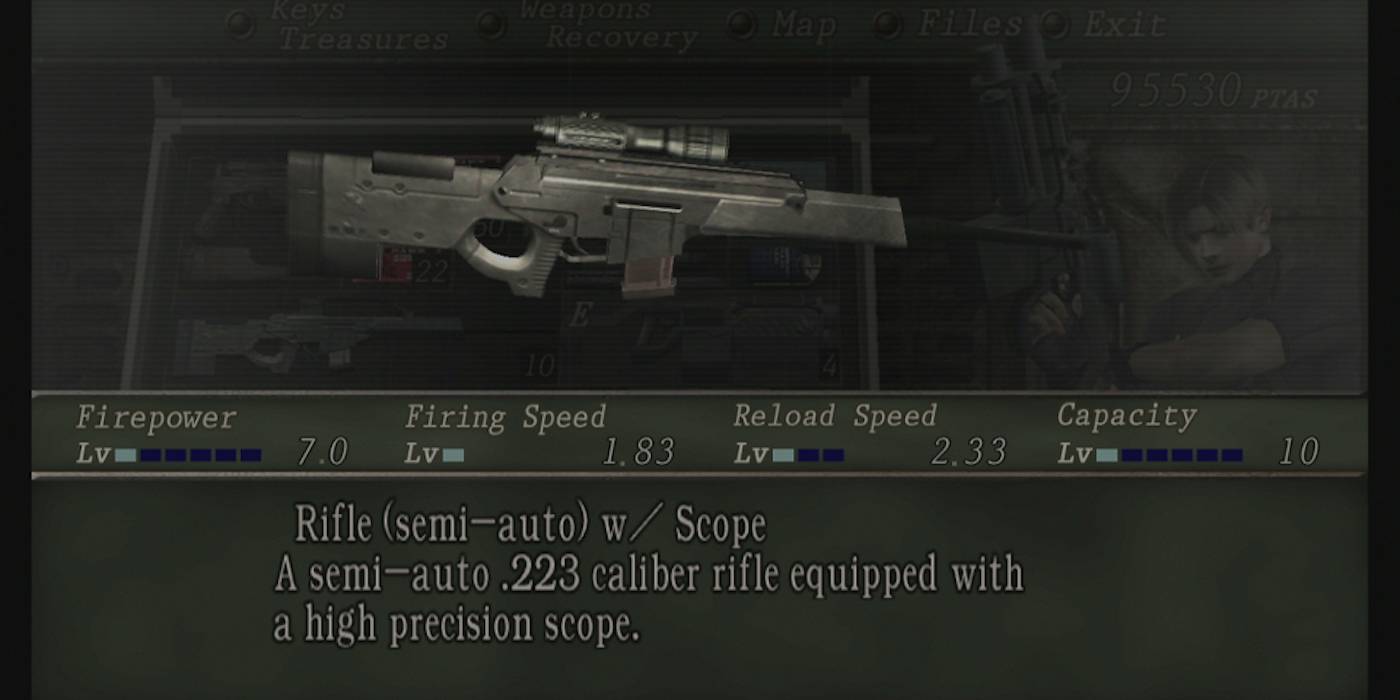 Resident Evil 4. Typically I would recommend red 9 on first play through since you get it pretty early on so you dont have to go through the village with a gimped handgun or drop a bunch of cash you wont see again on upgrading handgun or punisher additionally you get the amazing exclusive a bit earlier on that the blacktail. With the diversity of new enemies that we see in Resident Evil 4 the Rifle is actually one of the more useful weapons in the game.